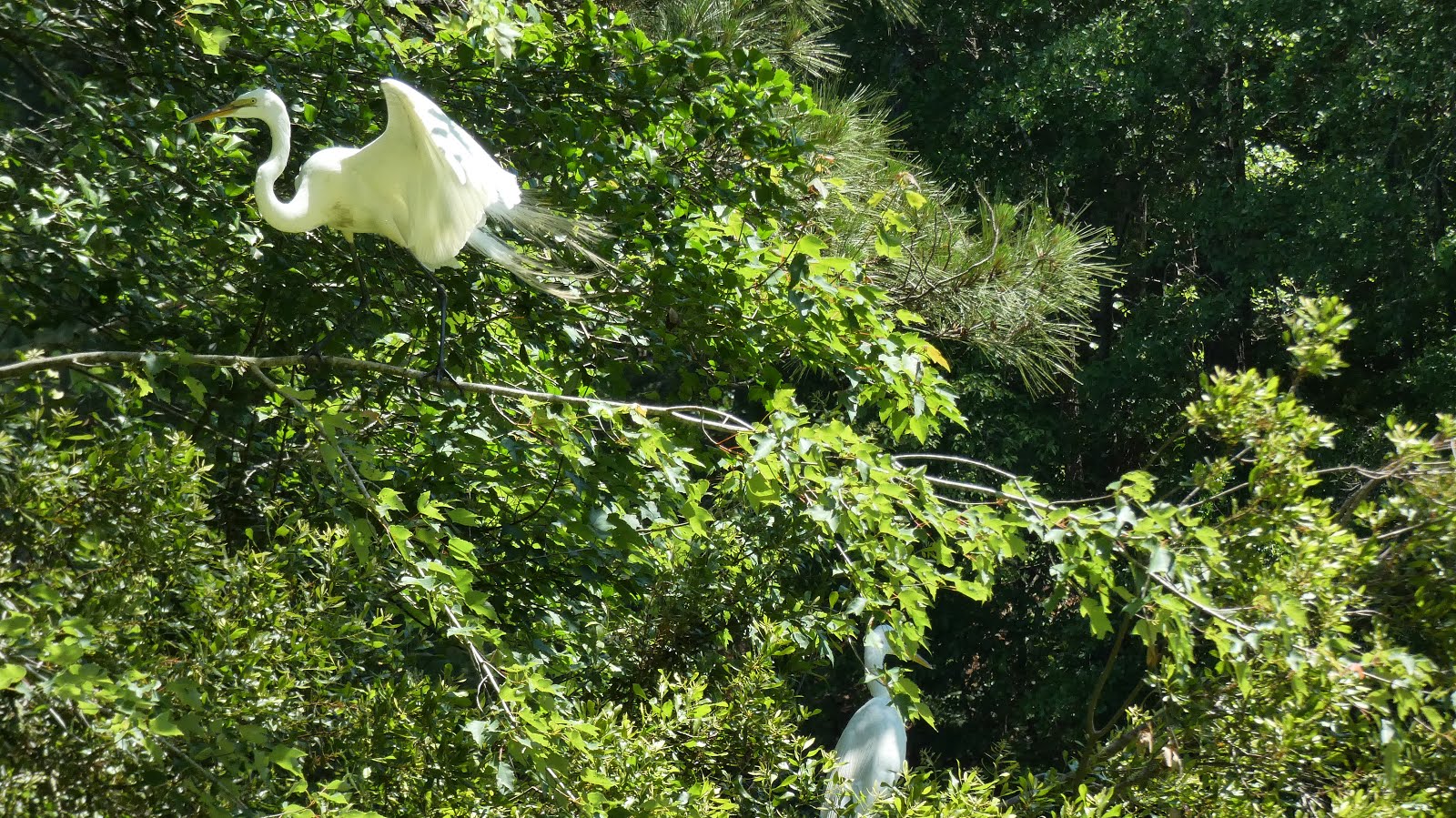 I could hear the chatter asa I exited the van. A whole bunch of chicks begging to be fed is quite a roar! Not only Great Egrets are nesting here but also Anhinga, Green Heron, Cattle Egret, and more. Since it is private land owned by a hunt club, no one is in residence, but it's marked private keep out...so under the chain I dodged only for 15 mins total. If I had permission to walk down the road or put a small boat in the pond I could see much more.