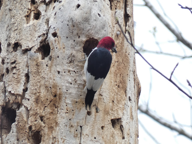 This Red Headed Woodpecker was bringing food to a nesting cavity probably for the female who may be sitting on some eggs!